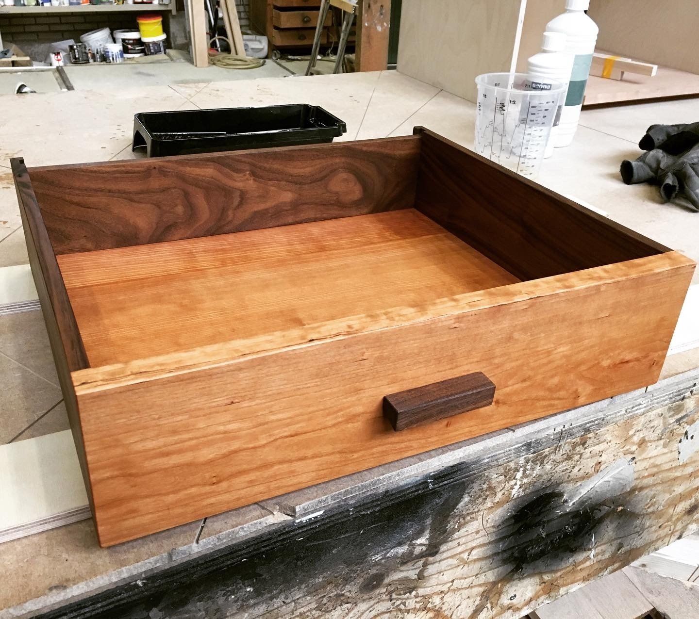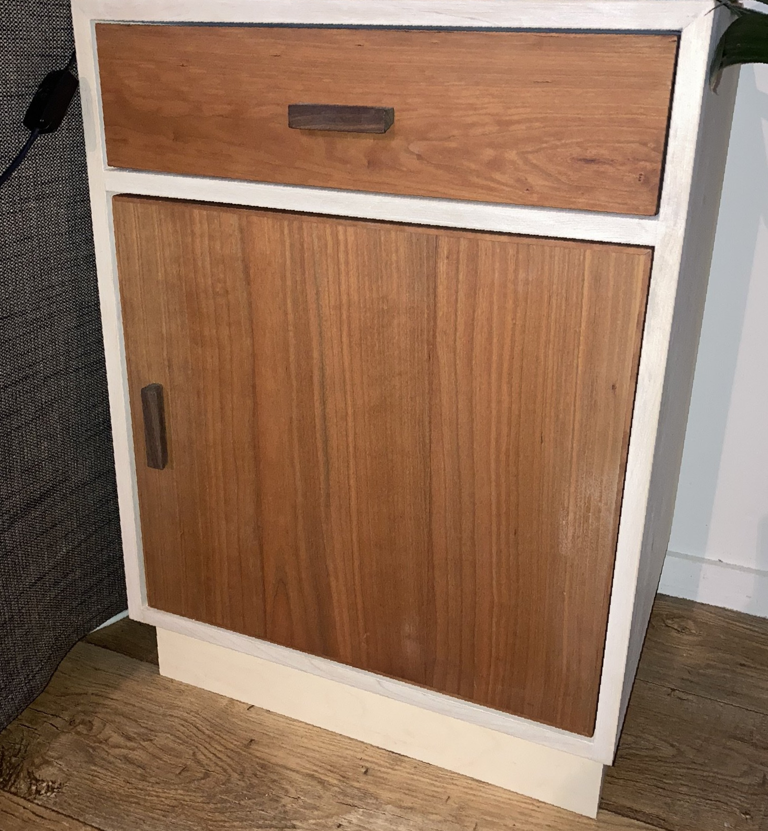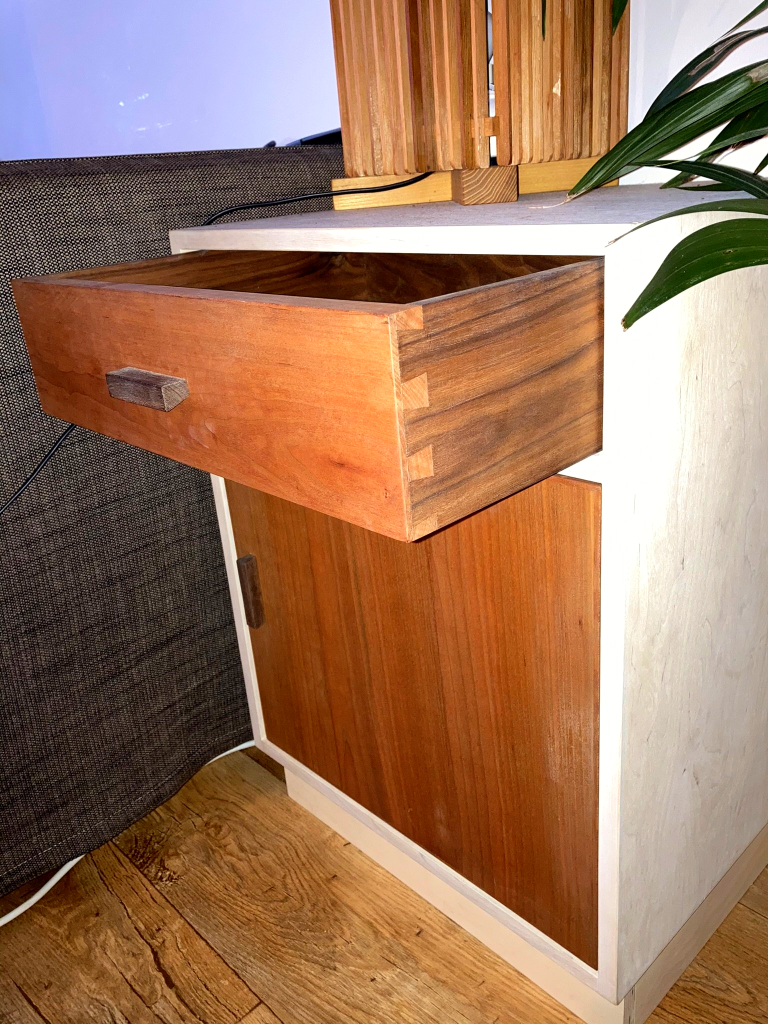 Deze kast heb ik gemaakt in het tweede jaar van mijn opleiding aan het HMC. Gemaakt van berken multiplex, kersen, walnoot en esdoorn. De kast is afgewerkt met witte Rubio Monocoat. Lade heeft halfverdekte zwaluwstaartverbindingen. Verder volgt het een vrij standaard constructie.